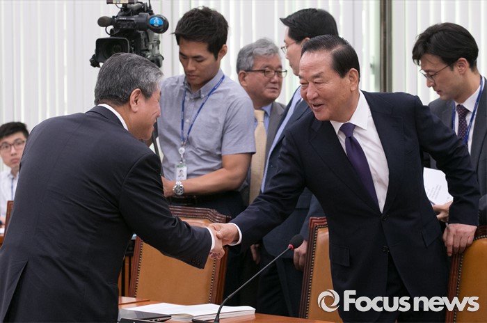 (서울=포커스뉴스) 27일 오전 서울 여의도 국회에서 열린 외교통일위원회 전체회의에 참석한 서청원(오른쪽) 새누리당 의원과 배정호 민주평통 사무처장이 인사하고 있다.