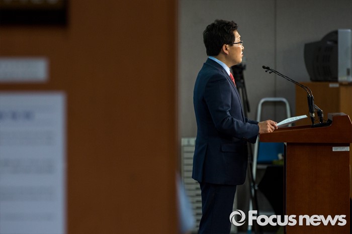 (서울=포커스뉴스) 김용태 새누리당 의원이 27일 오전 서울 여의도 국회에서 오는 8월 9일에 열리는 차기 전당대회 당 대표 경선 출마를 선언 하고 있다.