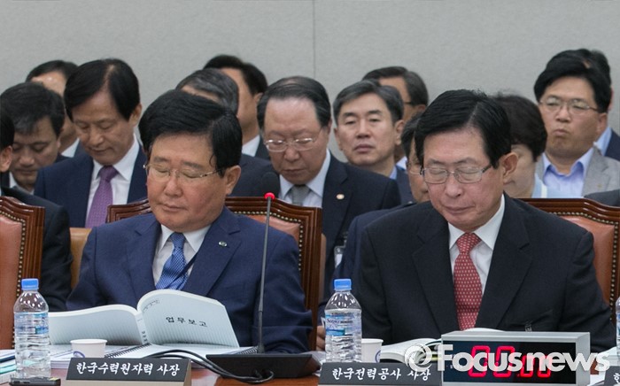 (서울=포커스뉴스) 27일 오전 서울 여의도 국회에서 열린 산업통상자원위원회 전체회의에 참석한 조석(왼쪽) 한국수력원자력 사장, 조환익 한국전력공사 사장이 자료를 살펴보고 있다.