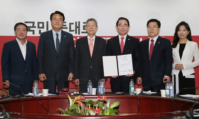 (서울=포커스뉴스) 김희옥 새누리당 혁신비대위원장이 27일 오전 서울 여의도 당사에서 박명재 신임 사무총장에게 임명장을 수여한 뒤 기념촬영을 하고 있다. 왼쪽부터 정승 비대위원, 정진석 원내대표, 김 위원장, 박 신임 사무총장, 김광림 정책위의장, 임윤선 비대위원. <사진제공=새누리당>