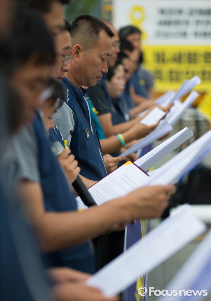 (서울=포커스뉴스) 전국공무원노동조합 조합원들이 27일 오전 서울 종로구 정부서울청사 앞에서 성과퇴출제 폐지, 공무원법 개악 저지 촉구 지도부 단식농성 투쟁 기자회견문을 낭독하고 있다.