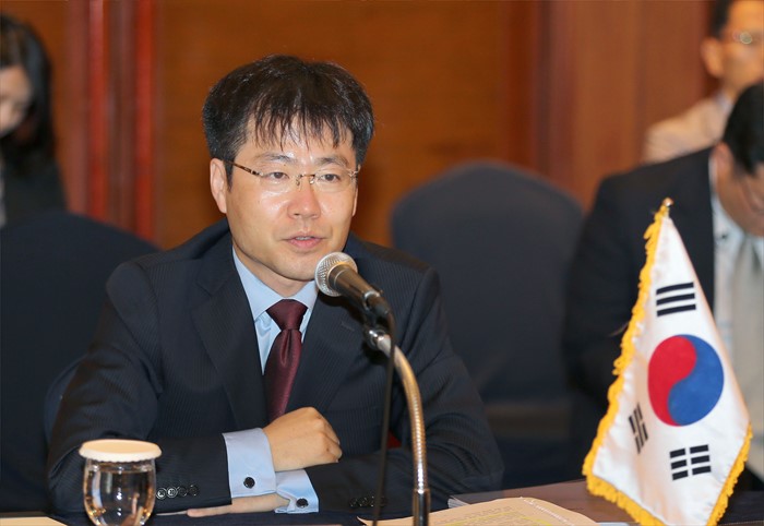 (서울=포커스뉴스) 여한구 산업통상자원부 FTA정책관(수석대표)이 27일 서울 중구 소공동 롯데호텔 에메랄드홀에서 네타 바엘(Netta Bar-El) 이스라엘 경제산업부 양자무역협정장(수석대표)을 비롯한 한-이스라엘 양국 정부대표단 50여명이 참석한 가운데 한-이스라엘 FTA(자유무역협정) 제1차 협상에서 인사말을 하고 있다. <사진제공=산업통상자원부>