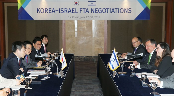 (서울=포커스뉴스) 여한구 산업통상자원부 FTA정책관(수석대표)이 27일 서울 중구 소공동 롯데호텔 에메랄드홀에서 네타 바엘(Netta Bar-El) 이스라엘 경제산업부 양자무역협정장(수석대표)을 비롯한 한-이스라엘 양국 정부대표단 50여명이 참석한 가운데 한-이스라엘 FTA(자유무역협정) 제1차 협상에서 인사말을 하고 있다. <사진제공=산업통상자원부>