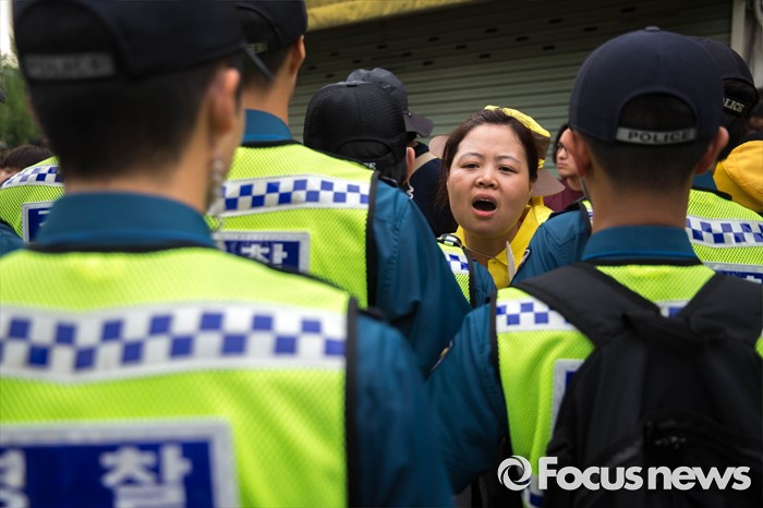(서울=포커스뉴스) 27일 오후 서울 종로구 정부서울청사 앞에 세월호 관계자들이 세월호 특별법 개정 및 선체 인양을 촉구하는 기자회견을 하기 위해 청운동주민센터 앞으로 이동하던 중 경찰 병력에 의해 길이 가로막히자 행진에 참석한 한 유가족이 망연자실 하고 있다.