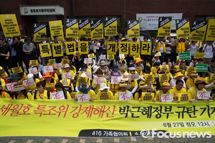 (서울=포커스뉴스) 27일 오후 서울 종로구 청운효자동주민센터 앞에서 416 가족협의회와 416 연대 관계자들이 세월호 특조위 강제해산과 박근혜 정부를 규탄하는 기자회견을 하고 있다.