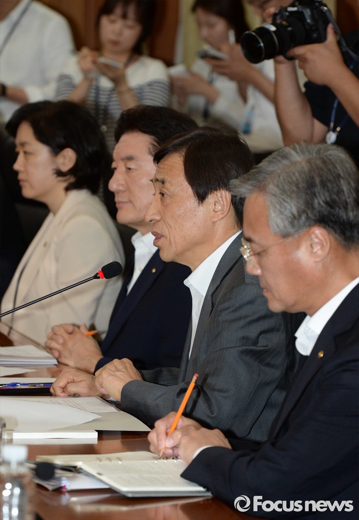 (서울=포커스뉴스) 해외 순방에서 조기 귀국한 이주열 한국은행 총재가 27일 오후 서울 중구 한국은행에서 열린 긴급 간부회의에 참석해 모두발언 하고 있다. 이 총재는 이날 브렉시트(영국의 유럽연합 탈퇴)에 따른 국내외 금융시장 동향 점검 및 대응 방안 논의를 위해 회의를 주재했다.