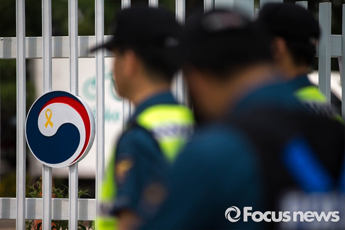 (서울=포커스뉴스) 27일 오후 서울 종로구 정부서울청사 정문 앞 대한민국정부 로고 위에 세월호 희생자들을 기리는 노란 리본이 붙어 있다.