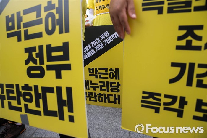 (서울=포커스뉴스) 27일 오후 서울 종로구 정부서울청사 앞에 세월호 관계자들이 세월호 특별법 개정 및 선체 인양을 촉구하는 손피켓을 들고 있다.