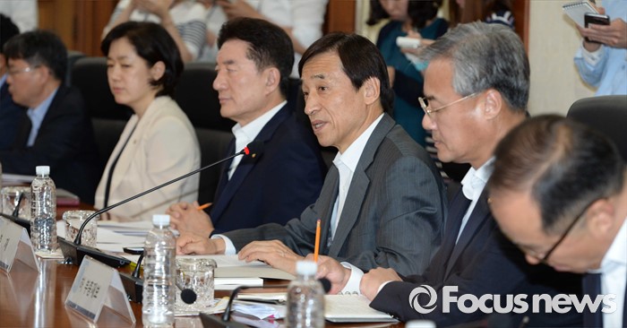 (서울=포커스뉴스) 해외 순방에서 조기 귀국한 이주열 한국은행 총재가 27일 오후 서울 중구 한국은행에서 열린 긴급 간부회의에 참석해 모두발언 하고 있다. 이 총재는 이날 브렉시트(영국의 유럽연합 탈퇴)에 따른 국내외 금융시장 동향 점검 및 대응 방안 논의를 위해 회의를 주재했다.