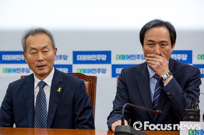 (서울=포커스뉴스) 우상호(오른쪽) 더불어민주당 원내대표가 27일 오후 서울 여의도 국회에서 이석태 세월호특별조사위원회 위원장과 면담 면담 준비 하고 있다.