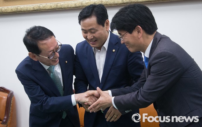 (서울=포커스뉴스) 7월 임시국회 일정 등을 논의하기 위해 모인 여야 3당 원내수석부대표가 27일 오후 서울 여의도 국회에서 회동에 앞서 손을 맞잡고 있다. 왼쪽부터 김도읍 새누리당, 김관영 국민의당, 박완주 더불어민주당 원내수석부대표