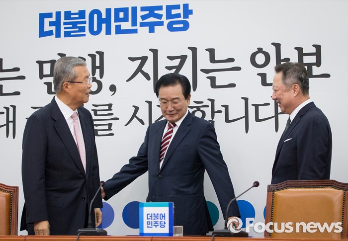 (서울=포커스뉴스) 김종인(왼쪽) 더불어민주당 비상대책위원회 대표와 변재일 정책위의장이 28일 오전 서울 여의도 국회에서 박용만(오른쪽) 대한상공회의소 회장을 접견하고 있다.