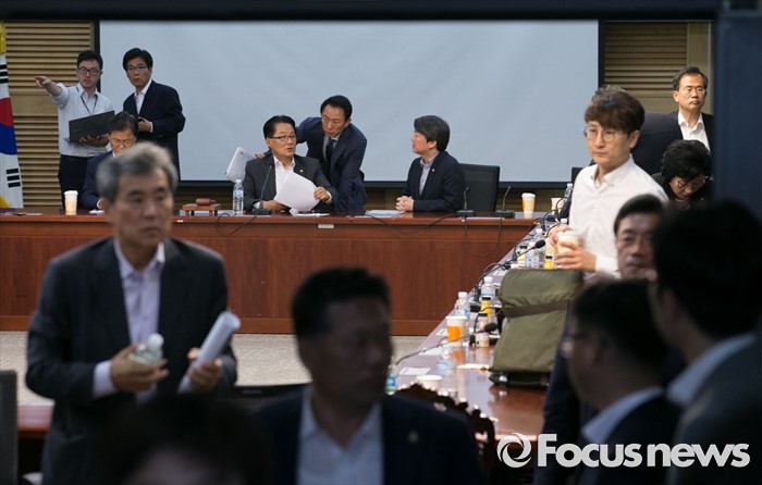 (서울=포커스뉴스) 28일 오전 서울 여의도 국회 의원회관에서 왕주현 전 사무부총장 구속 등 리베이트 수수 의혹 관련 비공개 국민의당 의원총회를 마친 안철수(오른쪽부터) 상임공동대표, 김명진 원내대표비서실장, 박지원 원내대표가 대화하고 있다.