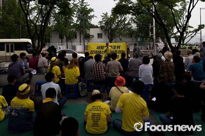 (서울=포커스뉴스) 28일 오전 서울 종로구 정부서울청사 인근 공원에서 열린4.16가족협의회·4.16연대 '세월호 특조위 강제해산에 대응하는 각계 긴급 회의'에 가족협의회 및 시민들이 참석하고 있다.