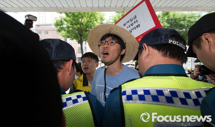 (서울=포커스뉴스) 28일 오전 서울 마포구 한국경영자총연합회 회관 앞에서 알바노조 조합원들이 10년 연속 최저임금 동결을 주장하는 경총에 항의방문 하자 경찰이 막고 있다.