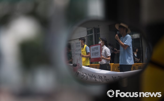 (서울=포커스뉴스) 28일 오전 서울 마포구 한국경영자총연합회 회관 앞에서 알바노조 조합원들이 10년 연속 최저임금 동결을 주장하는 경총에 항의방문 전 발언 하고 있다.