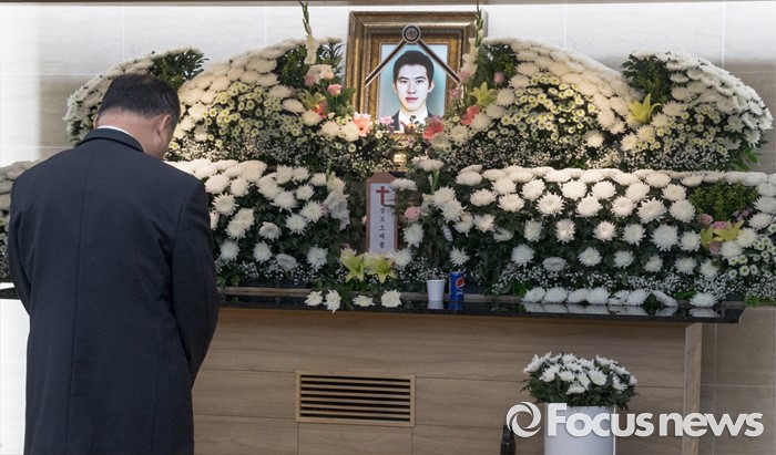 (서울=포커스뉴스) 28일 오후 서울 성동구 한양대학교병원 장례식장에 마련된 故 오세종(34) 전 쇼트트랙 국가대표 선수의 빈소를 찾은 한 조문객이 묵념하고 있다.