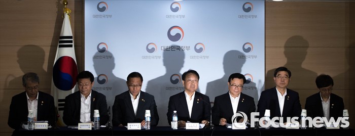 (서울=포커스뉴스) 28일 오후 서울 종로구 정부서울청사 브리핑룸에서 유일호(왼쪽 네번째) 경제부총리가 정부의 추경 등 하반기 경제정책방향을 발표하고 있다.