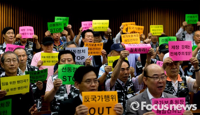 (서울=포커스뉴스) 28일 오전 서울 여의도 국회 헌정기념관에서 열린 '임을 위한 행진곡' 기념곡 지정저지 범국민대책본부 출범식 및 결의대회에 참석한 관련단체 회원 및 참석자들이 피켓을 들고 구호를 외치고 있다.