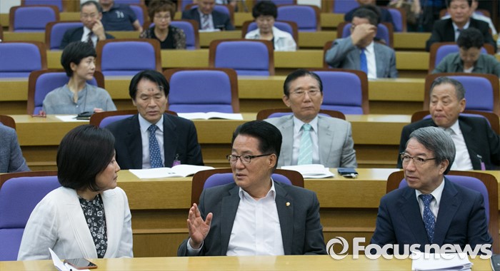 (서울=포커스뉴스) 28일 오전 서울 여의도 국회 의원회관에서 열린 '한국적 제3의 길' 창립 기념 초청 강연, '한국경제와 20대 국회가 가야할 길'에 참석한 박영선(왼쪽부터) 더불어민주당 의원, 박지원 국민의당 원내대표, 정운찬 동반성장연구소 이사장이 대화하고 있다.