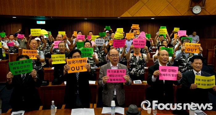 (서울=포커스뉴스) 28일 오전 서울 여의도 국회 헌정기념관에서 열린 '임을 위한 행진곡' 기념곡 지정저지 범국민대책본부 출범식 및 결의대회에 참석한 관련단체 회원 및 참석자들이 피켓을 들고 구호를 외치고 있다.