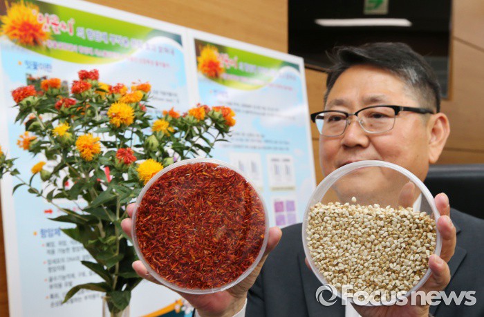 (세종=포커스뉴스) 이종기 농촌진흥청 인삼특작부장이 28일 오전 세종시 정부세종청사 농림축산식품부 기자실에서 폐암, 위암, 식도암 등 고형암에 대표적으로 사용하는 항암제의 부작용을 줄이 수 있는 잇꽃(홍화)씨 추출물의 효과를 구명했다고 밝히고 있다.