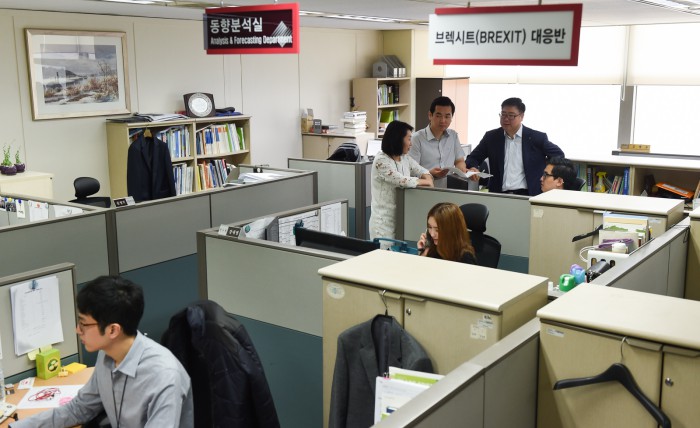 협회는 이 외에도 다음달 1일 삼성동 무역센터에서 무역업체 임직원을 대상으로 '브렉시트 관련 긴급현안 설명회'를 개최한다. 또 정보가 상대적으로 부족한 지방 무역업계를 위해 무역협회의 13개 국내지역본부 및 소속 현장자문위원 활동을 강화한다. 앞서 협회는 지난 28일 이사회 및 회장단회의 개최를 통해 브렉시트 관련 영향을 안내하기도 했다.한국무역협회 '브렉시트 대응반' 소속 직원들이 대외경제상황 등을 모니터한 후 회의를 하고 있다. <사진제공=한국무역협회>