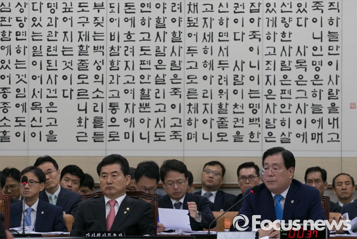 (서울=포커스뉴스) 28일 오후 서울 여의도 국회에서 열린 법제사법위원회 전체회의에 참석한 황찬현(오른쪽) 감사원장이 의원들의 질의에 답하고 있다.