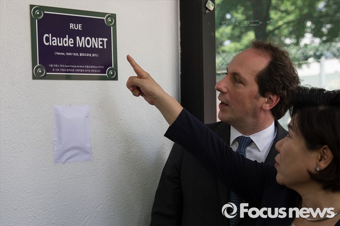 (서울=포커스뉴스) 28일 오후 서울 서초구 서울프랑스학교에서 파비앙 페논(오른쪽 두 번째) 주한 프랑스 대사와 조은희 서초구청장이 '파리식 길 표지판 공개 행사'에 참석해 표지판을 살펴보고 있다.