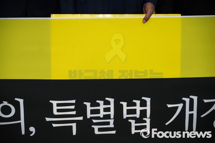 (서울=포커스뉴스) 416가족협의회와 4월16의약속국민연대가 28일 오후 서울 여의도 국회 앞에서 20대 국회, 6월 임시국회에 세월호 특별법 개정을 촉구하는 기자회견을 하고 있다.