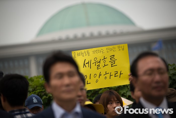 (서울=포커스뉴스) 416가족협의회와 4월16의약속국민연대가 28일 오후 서울 여의도 국회 앞에서 '20대 국회 6월 임시국회에 특별법 개정 촉구' 기자회견을 하고 있다. 노회찬(오른쪽) 정의당 원내대표와 윤소하(왼쪽) 정의당 의원이 참석하고 있다.