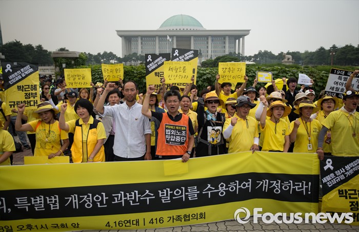 (서울=포커스뉴스) 416가족협의회와 4월16의약속국민연대가 28일 오후 서울 여의도 국회 앞에서 '20대 국회 6월 임시국회에 특별법 개정 촉구' 기자회견을 하고 있다.