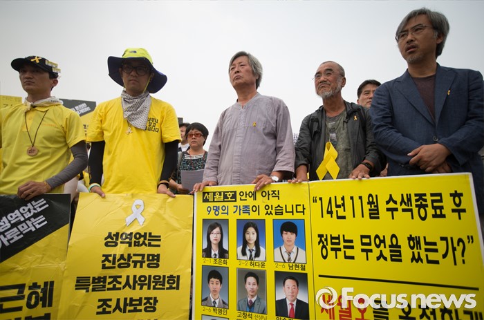 (서울=포커스뉴스) 416가족협의회와 4월16의약속국민연대가 문규현(오른쪽 두번째) 신부와 함께 28일 오후 서울 여의도 국회 앞에서 '20대 국회 6월 임시국회에 특별법 개정 촉구' 기자회견을 하고 있다.