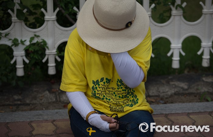 (서울=포커스뉴스) 416가족협의회와 4월16의약속국민연대가 28일 오후 서울 여의도 국회 앞에서 '20대 국회 6월 임시국회에 특별법 개정 촉구' 기자회견을 가졌다. 한 관계자가 국회 정문 앞에 앉아 슬픔에 잠겨 있다.