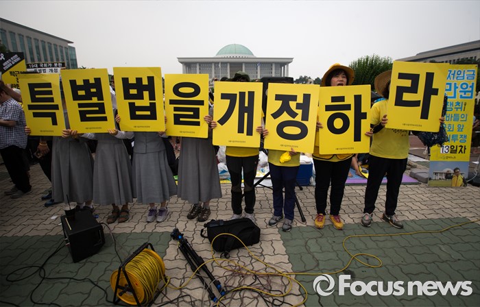 (서울=포커스뉴스) 416가족협의회와 4월16의약속국민연대가 28일 오후 서울 여의도 국회 앞에서 '20대 국회 6월 임시국회에 특별법 개정 촉구' 기자회견을 하고 있다.