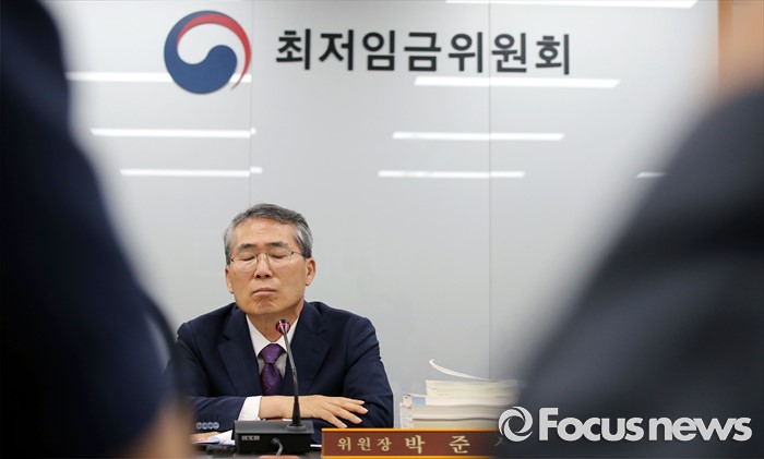 김 회장은 최저임금을 월급으로 표기해야 한다는 노동계의 주장에 대해서도 "PC방, 편의점, 주유소 등 업종의 경우 초단기 근로자들이 대부분으로 주휴수당 대상이 아닌 초단기 근로자들에게 혼란을 줄 수 있고, 영세 사업자에게 부담을 줄 수 있다"고 반대 입장을 분명히 했다.(세종=포커스뉴스) 박준성 최저임금위원회 위원장이 28일 오후 세종시 정부세종청사 고용노동부 최저임금위원회 전원히의실에서 열린 최저임금위원회 제7차 전원회의에서 잠시 생각에 잠겨 있다.최저임금위원회는 고용부 장관의 최저임금 심의 요청을 받은 날(3월30일)로부터 90일 이내인 이날(6월28일)까지 내년도 최저임금 인상안을 심의·의결해야 한다. 올해 시간당 최저임금은 6030원, 월급으로는 126만 원(월 209시간 기준)이다. 2016.06.28 김기태 기자