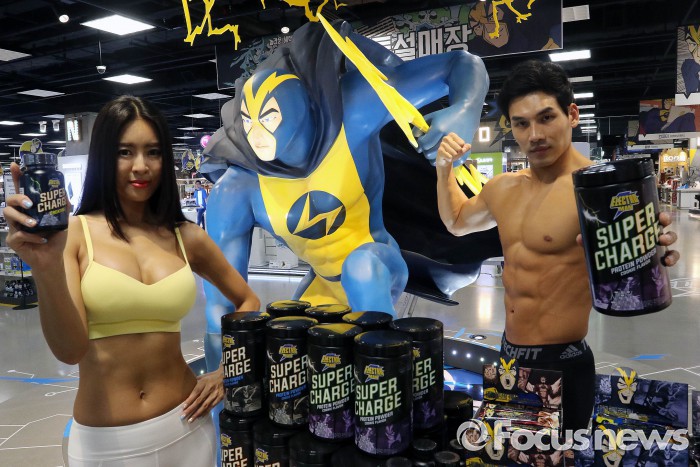 이번에 선보이는 제품은 일렉트로맨△슈퍼차지 프로틴 파우더 초코·쿠키 2종(900g, 4만4800원)△슈퍼차지 크레아틴(120정, 2만4800원)△슈퍼차지 하이프로틴바 피넛·블랙쿠키·크랜베리 3종(80g, 1980원)이다.
