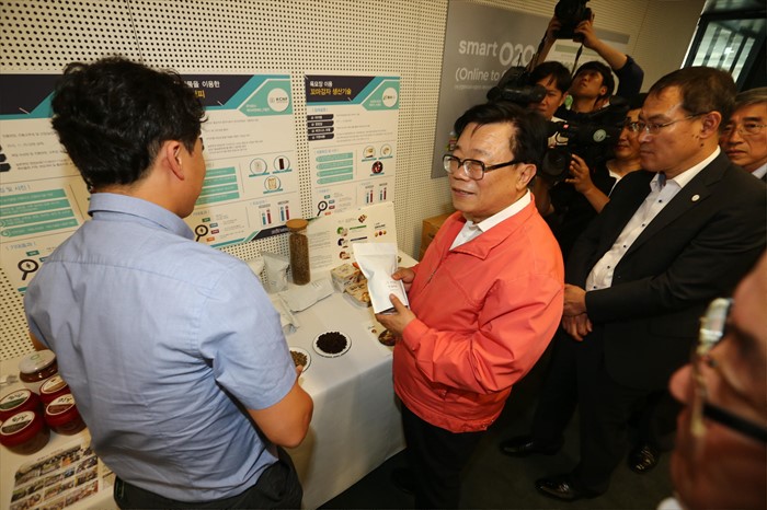 (춘천=포커스뉴스) 국민공감과 소통을 위해 현장을 찾은 이동필 농림축산식품부 장관이 28일 강원도 춘천시 강원창조경제혁신센터에서 열린 농식품 벤처창업기업 간담회를 마치고 전시된 창업지원 성과물을 둘러보고 있다. <사진제공=농림축산식품부>