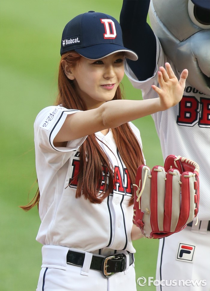 (서울=포커스뉴스) 28일 서울 잠실구장에서 열린 2016 프로야구 NC-두산 경기에서 걸그룹 소나무의 나현이 시구를 마치고 퇴장하며 손을 흔들며 인사하고 있다.