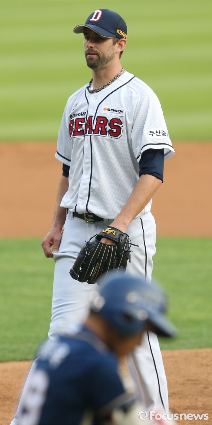 (서울=포커스뉴스) 28일 서울 잠실구장에서 열린 2016 프로야구 NC-두산 경기에서 1회초 두산 선발투수 니퍼트가 NC 선두타자 이종욱을 볼넷으로 내보내며 아쉬워하고 있다.