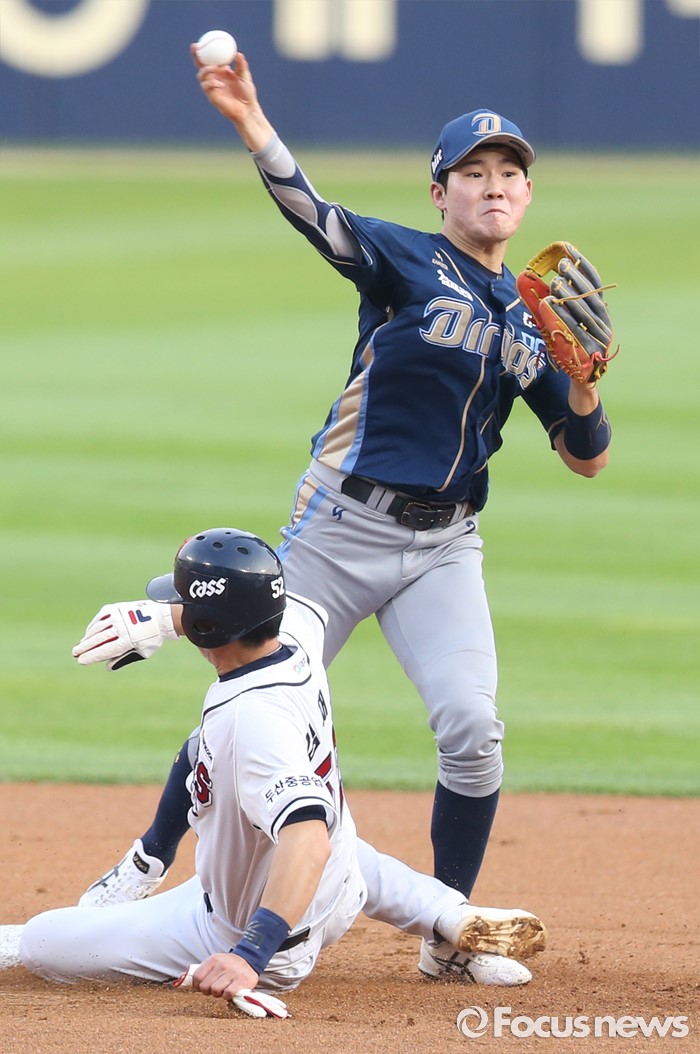 (서울=포커스뉴스) 28일 서울 잠실구장에서 열린 2016 프로야구 NC-두산 경기 1회말 무사 1루에서 NC 2루수 박민우가 두산 1루주자 김재호를 포스아웃시키고 1루로 송구하며 더블플레이를 노리고 있다.