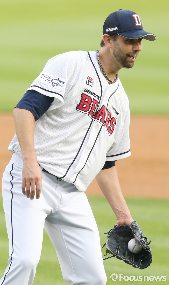 (서울=포커스뉴스) 28일 서울 잠실구장에서 열린 2016 프로야구 NC-두산 경기에서 두산 선발투수 니퍼트가 1회초 1루 백업 수비 동작을 재연하고 있다.