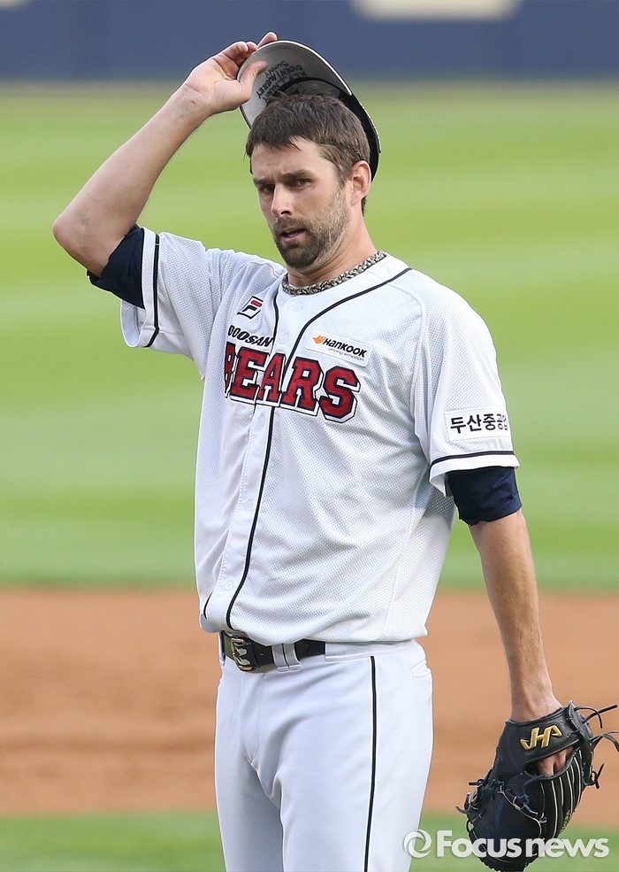 (서울=포커스뉴스) 28일 서울 잠실구장에서 열린 2016 프로야구 NC-두산 경기에서 두산 선발투수 니퍼트가 1회초 1사 만루의 상황에서 모자를 고쳐 쓰고 있다.