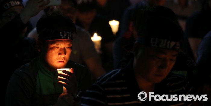 (세종=포커스뉴스) NH 농협중앙회노동조합원들이 28일 오후 세종시 정부세종청사 농림축산식품부 앞에서 농협법 개정 반대하는 1박 2일 노숙집회에서 촛불을 들고 있다.