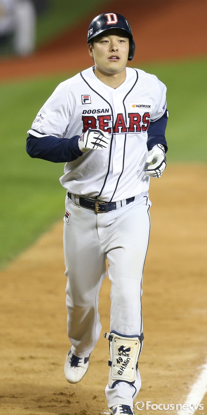(서울=포커스뉴스) 28일 서울 잠실구장에서 열린 2016 프로야구 NC-두산 경기 7회말 2사 1,2루에서 두산 민병헌이 좌월 3점 홈런을 치고 홈인하고 있다.