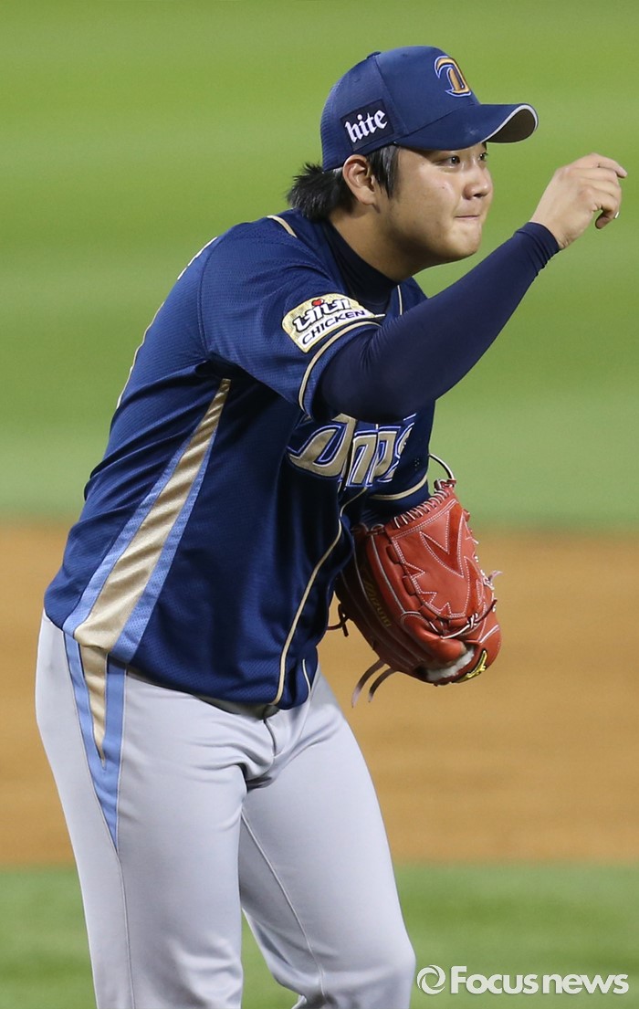 (서울=포커스뉴스) 28일 서울 잠실구장에서 열린 2016 프로야구 NC-두산 경기 5회말 NC 투수 이민호가 두산 김재호에게 머리 숙여 몸에 맞는 볼에 대해 사과하고 있다.