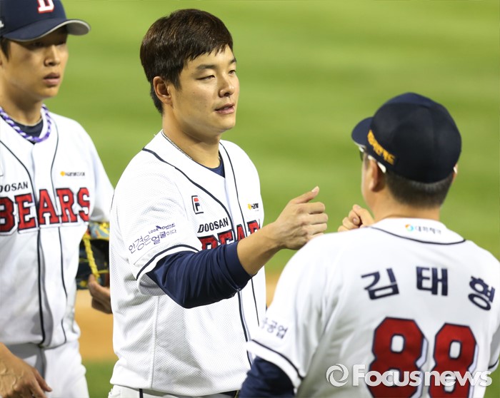 (서울=포커스뉴스) 28일 서울 잠실구장에서 열린 2016 프로야구 NC-두산 경기에서 NC를 물리치고 50승을 한 두산 민병헌이 김태형 감독의 마중을 받고 있다.