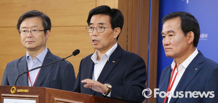 (세종=포커스뉴스) 이근성 낙농진흥회장이 28일 오후 세종시 농림축산식품부 기자실에서 2016년 원유기본가격을 전년보다 18원 인하한 리터당 922원으로 결정했다고 밝히고 있다. 왼쪽부터 박상도 한국유가공협회 전무, 이근성 낙농진흥회장, 신관우 충북낙농협동조합장.