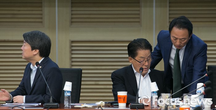 (서울=포커스뉴스) 29일 오전 서울 여의도 국회 의원회관에서 열린 국민의당 정책역량강화 워크숍에 참석한 박지원(가운데) 원내대표와 김명진(오른쪽) 원내대표비서실장이 대화하고 있다. 왼쪽은 안철수 상임공동대표.
