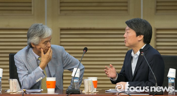 (서울=포커스뉴스) 29일 오전 서울 여의도 국회 의원회관에서 열린 국민의당 정책역량강화 워크숍에 참석한 안철수(오른쪽) 상임공동대표와 송호근 서울대 교수가 대화하고 있다.